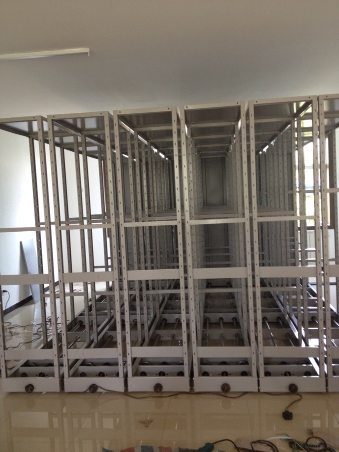 1、移動:可單列或多列一起在導軌上行走,每列具有手剎制動裝置(自鎖柄)。自鎖柄在OFF位置時,架體不能移動,在ON位置時,架體可移動,每列架體的側面板上有標簽框,移動列底務上有防倒裝置,每個組合箱體的前后各一列裝有總鎖,用于整體的鎖 閉,起到保密作用,導軌的端部安裝限位裝置。